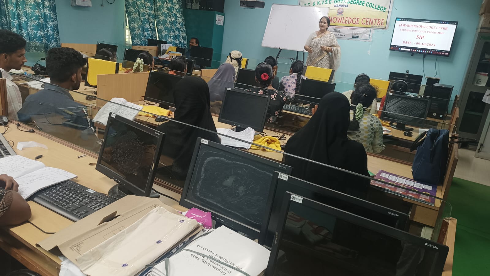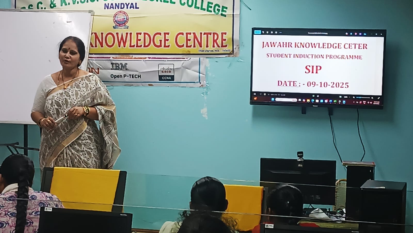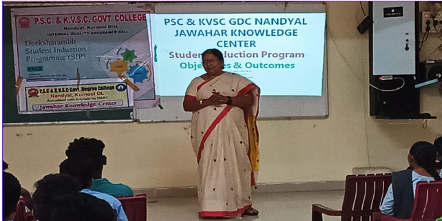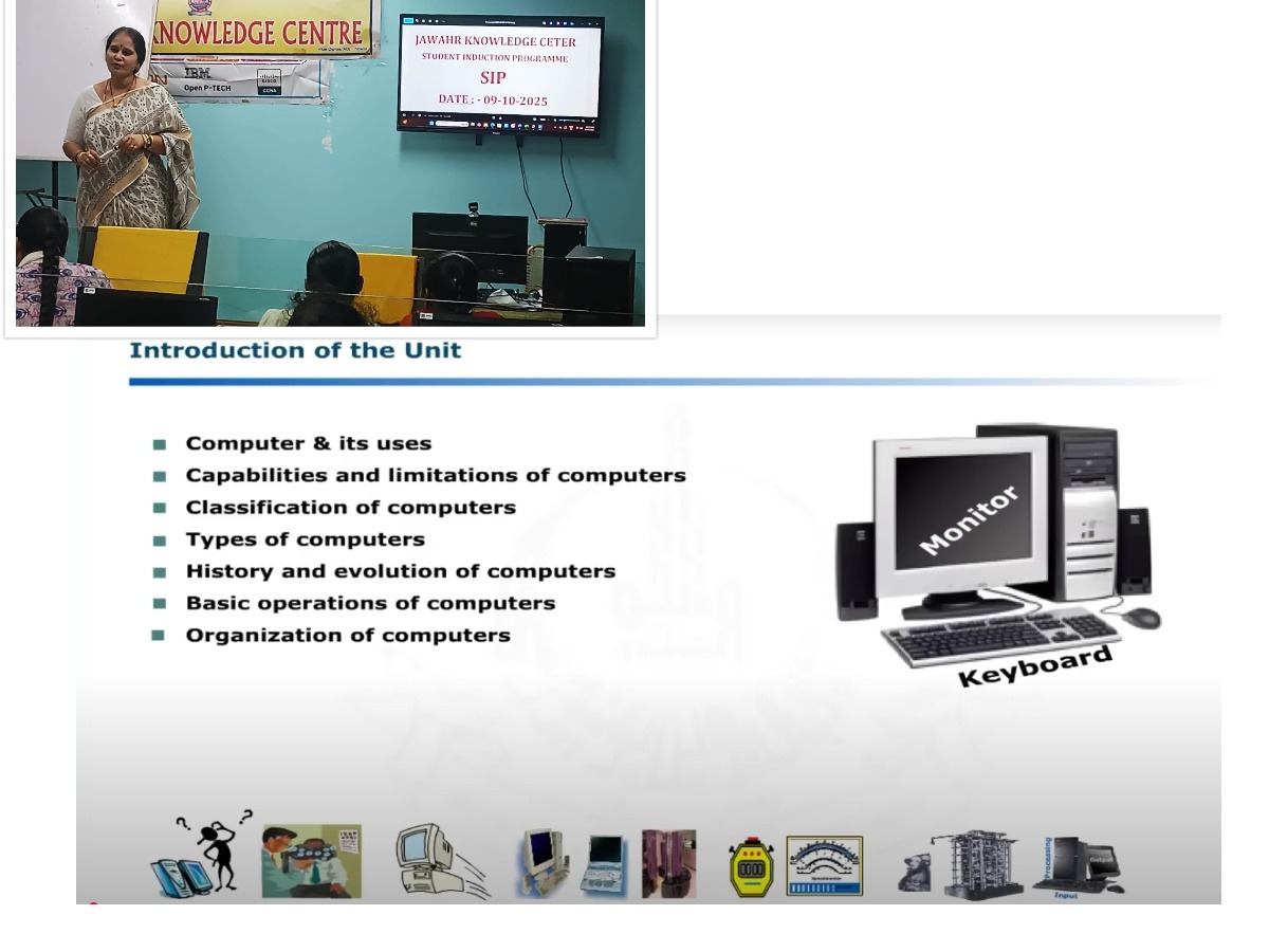 | A Student Induction Programme (SIP) session was conducted by JKC Coordinator Smt. S. Parvathi along with the JKC mentors for the first-year students of the Academic Year 2025–2026. The session aimed to introduce students to the objectives and activities of the Jawahar Knowledge Center (JKC). Smt. S. Parvathi elaborated on how JKC plays a vital role in enhancing students’ employability skills, communication abilities, and career readiness through various training programs and placement support initiatives. The coordinator emphasized how these courses help in improving students’ technical knowledge, professional development, and job opportunities. In addition, awareness was created on the importance of computers in daily life and the need for digital literacy. The mentors highlighted various digital initiatives that empower students to effectively use technology for learning, communication, and career growth. | |
