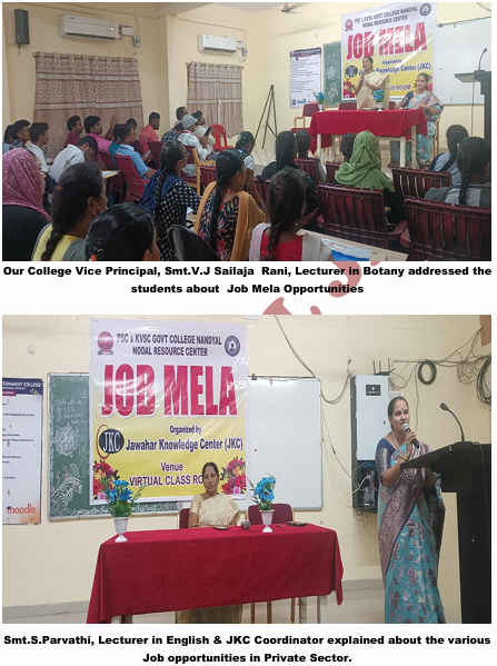 | Commissioner of Collegiate Education Organizing the Job Melas on the Platform of Society Of JKC . In this regrad our college Principal Dr N Shashikala Madam Garu arranged the 2 buses for transportation to Kadapa . Our College 150 Students are actively participated in the Job Mela which is held at GDC Men, Kadapa on 26-08-2023. | |