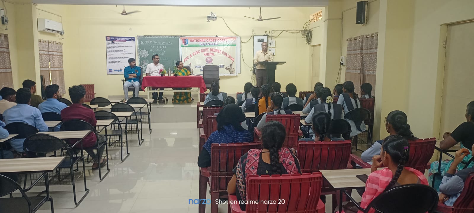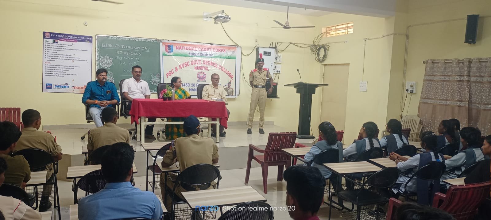 | On occasion of world tourism day NCC unit has conducted seminar to spread awareness on importance of tourism and protecting our historical and cultural sites. Sri krishna murthy raju has delivered lecture on importance of tourism. Dr, N. Shashikala garu, principal has presented gifts to the winners in elecution competitions. | |