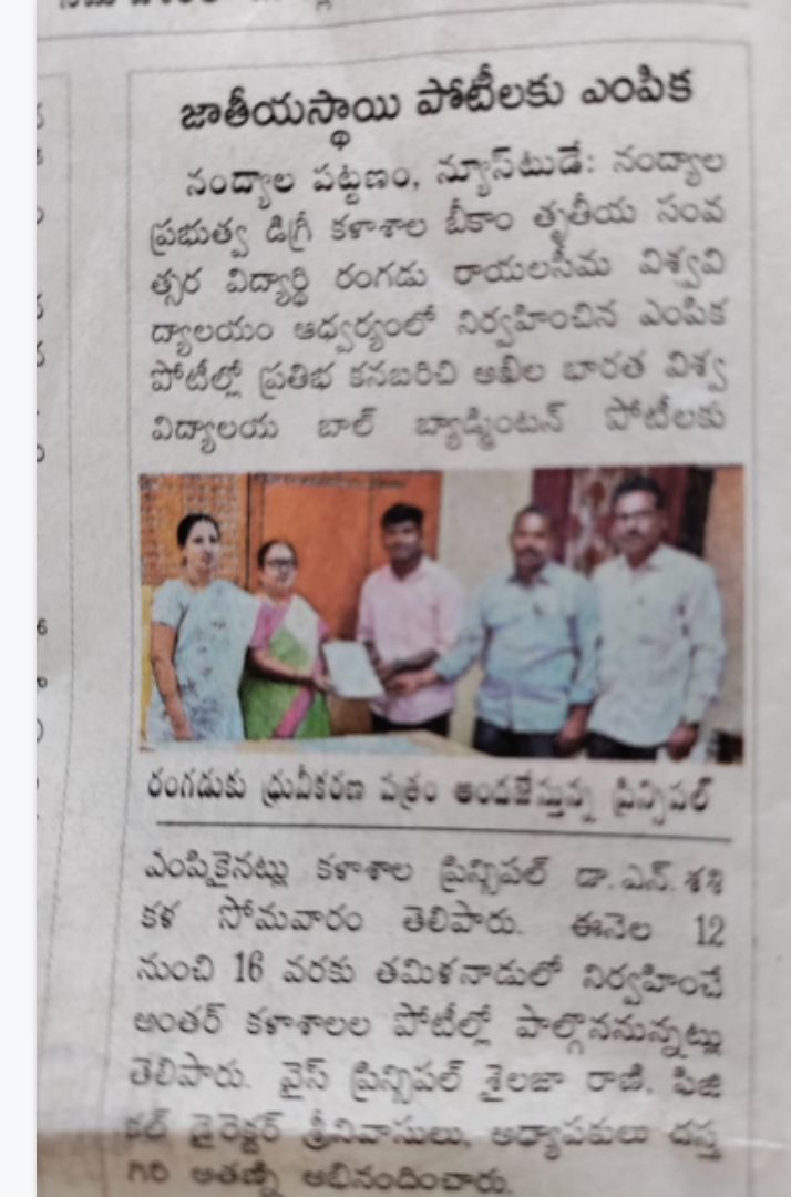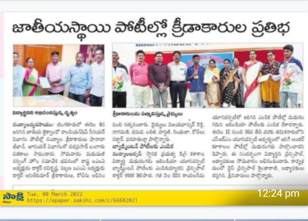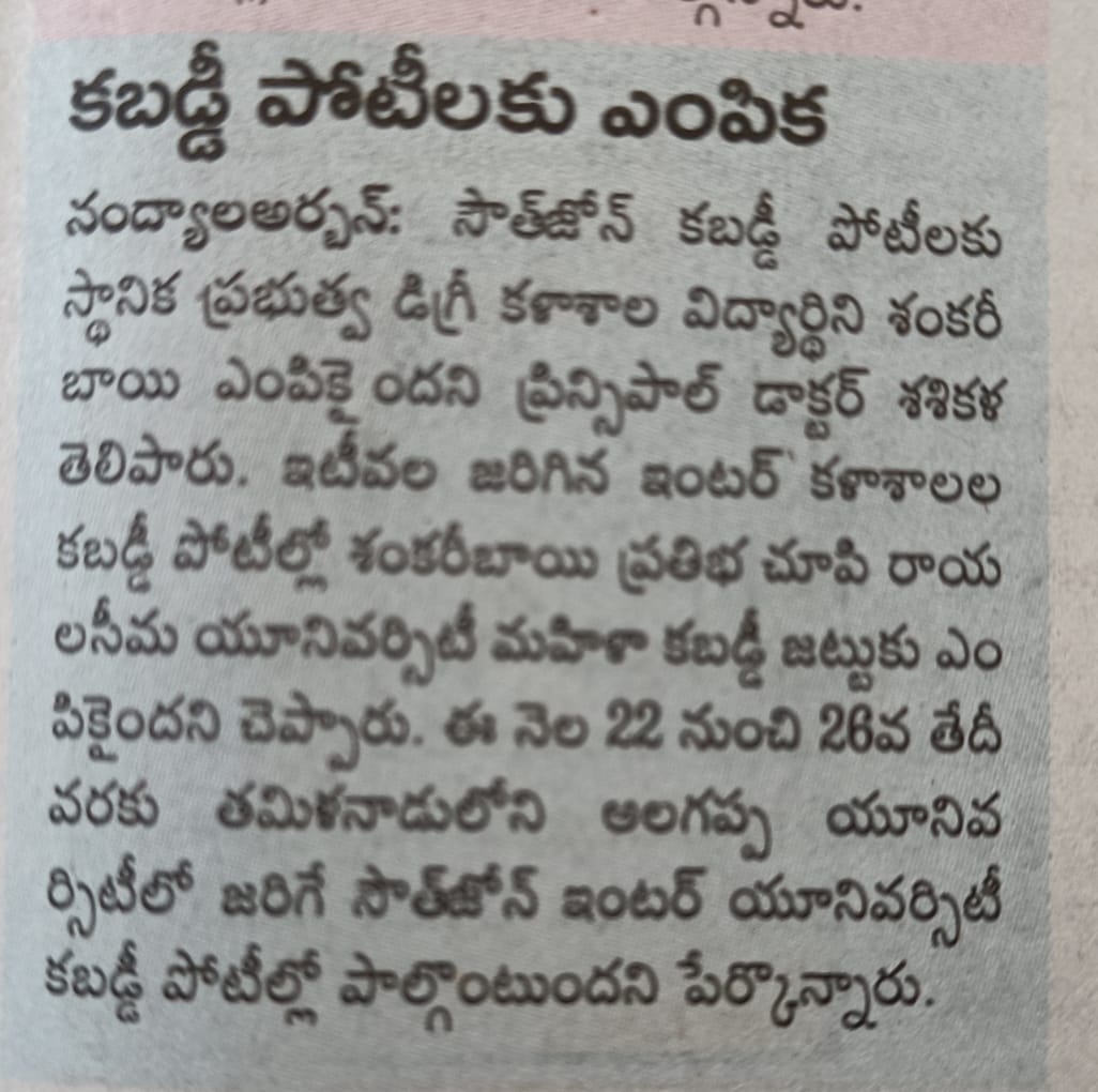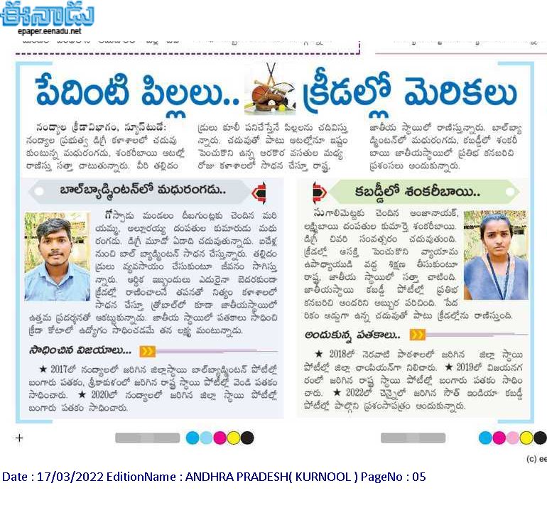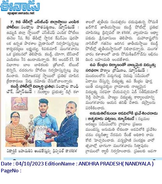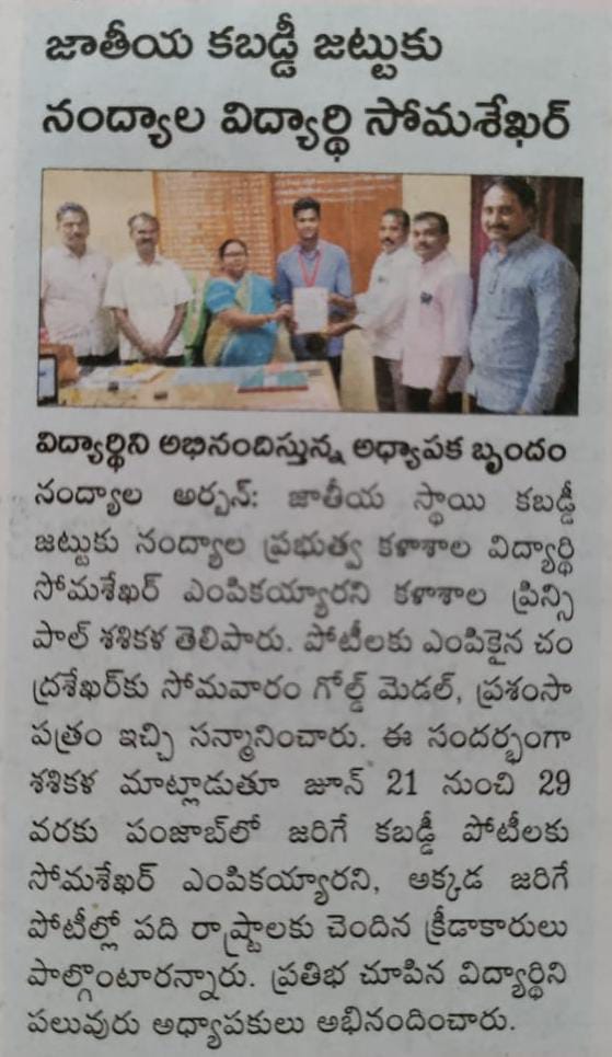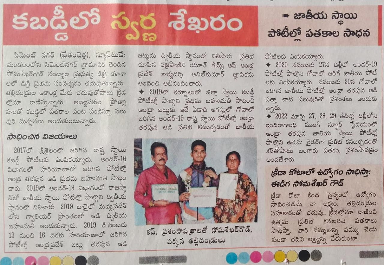 Physical education - National Gold Medal in Kabaddi S . Soma sekhar Goud I B.Sc (MECS) bagged gold medal in the game Kabaddi event age category 19 hel
