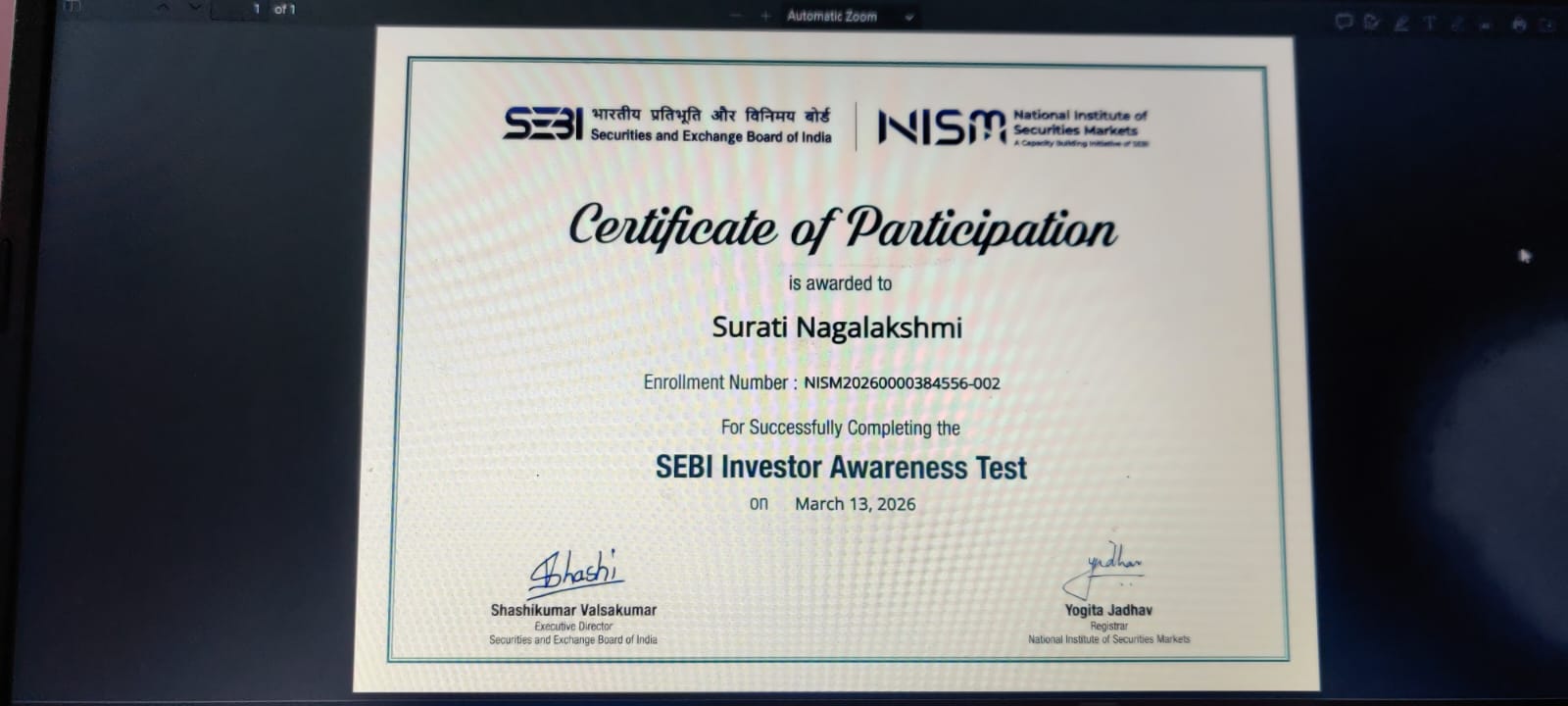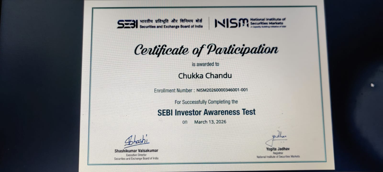 SEBI Test Certificate 13 03 2026